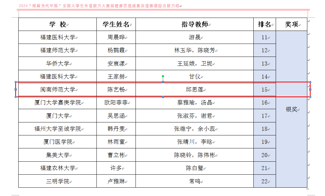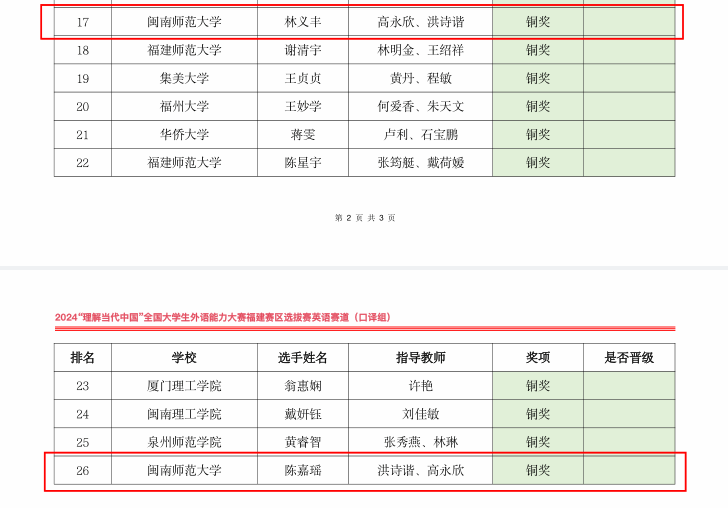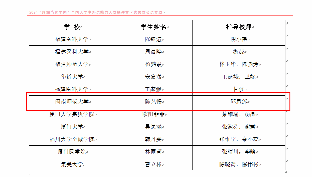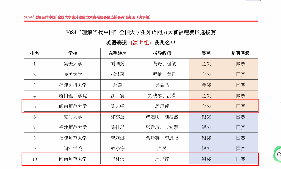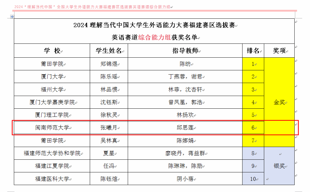 学子表现优异,张曦月和陈艺畅同学分别获得国际传播综合能力赛项金奖和银奖,陈艺畅和李林炜分别获得演讲赛项金奖和银奖,以上同学均已晋级国际传播综合能力国赛。此外,陈艺畅和孙虹分获笔译赛项银奖和铜奖,林义丰和陈嘉瑶均获得口译赛项铜奖。