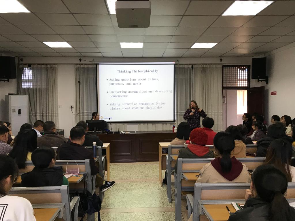 Kathy Hytten教授首先介绍美国教育的不同目的,如何分析美国教育的不同目的,比如学术的、社会的、政治的、经济的,等等。再分析不同的教育目的将如何影响不同的学校形象,接着分析传统与批判等不同学派的教育教学理论,例如在正式的或者显性的课程设置以及隐性的课程设置上。最后讲座介绍了美国现代教育理论的主要发展方向,比如人本主义的、社会效率的、发展的、社会改良的等等,深入介绍不同发展方向下当今美国显性课程和隐性课程的现状,以及不同发展方向下不同的教育目的,以及不同的教学方法。
