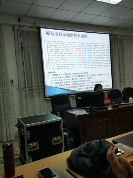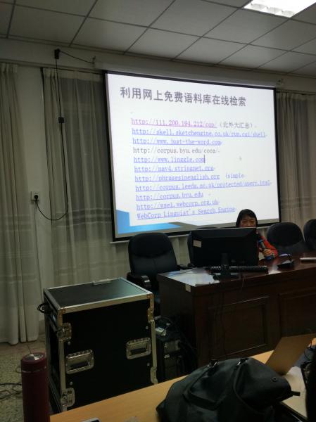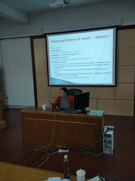 逸夫楼梯教二何教授举行了题为“语料库语言学与英语科研”的讲座,向我们介绍了语料库语言学的核心概念,阐述了语料的词汇共选、意义单位、多形态短语、关键词等概念,讲解中辅以实例操作,理论与实践相结合,深入浅出,获得了与会听众的一致好评。