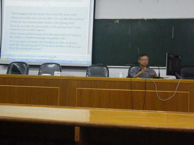 本次讲座的主题为Reader responses Theory and the Teaching of Literature 。蔡教授首先向我们介绍了阅读由浅入深的三个层次,开门见山,让大家对阅读的艺术有了初步了解。接着,蔡教授阐释了读者与文本的互动关系。他还向大家一一介绍了启发读者反应的许多活动,如期刊阅读、戏剧表演等。讲座期间蔡教授还兴致勃勃的同大家一起欣赏了两则故事以及一首励志诗,生动形象的对讲座内容作了进一步阐述。