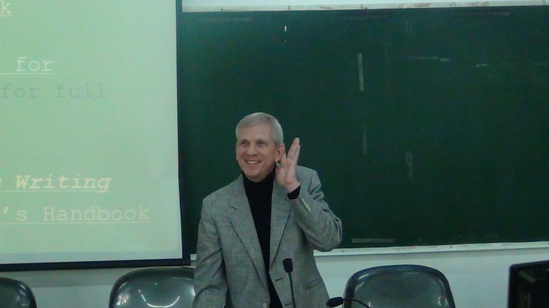 上午9:30,Bill Mann博士于逸夫楼梯教二开设了一场题为《Getting Published in English》的精彩讲座,讲座由外语系副主任吴玉玲教授主持。Bill Mann博士结合多年的教学实践和相关研究,就具体如何撰写学术论文进行了深入讲解。他从学术写作风格、写作结构以及如何选择期刊等几个方面结合实例做出了独到而深刻的解释。Bill Mann博士还耐心回答了大家提出的问题,特别就大家所关注的“中国学生英语写作存在的主要问题以及解决方法”提出了自己的见解。讲座内容丰富、条理清晰,令全体教师和研究生受益匪浅并赢得了满堂喝彩。