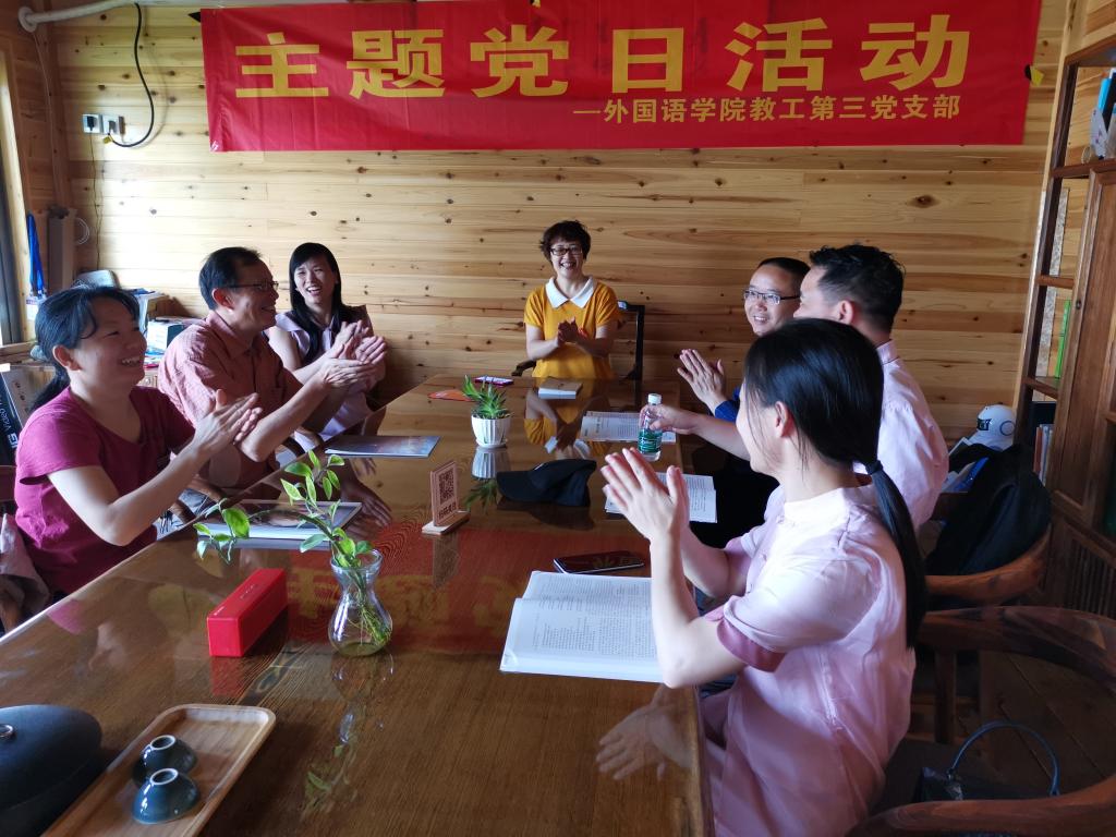 党员们在书院诵读毛主席诗词及译文,更进一步了解了毛泽东同志及其思想,体会到他的豪情壮志和家国情怀,也让大家更加深切地缅怀伟大领袖毛主席弘扬爱国主义精神,传承红色经典。接着,支部党员吴克炎教授给党员们开展了一场以"隐喻认知视域下的英汉习语对比及双向翻译"为主题学术讲座,党员们在讲座上热烈交流讨论。