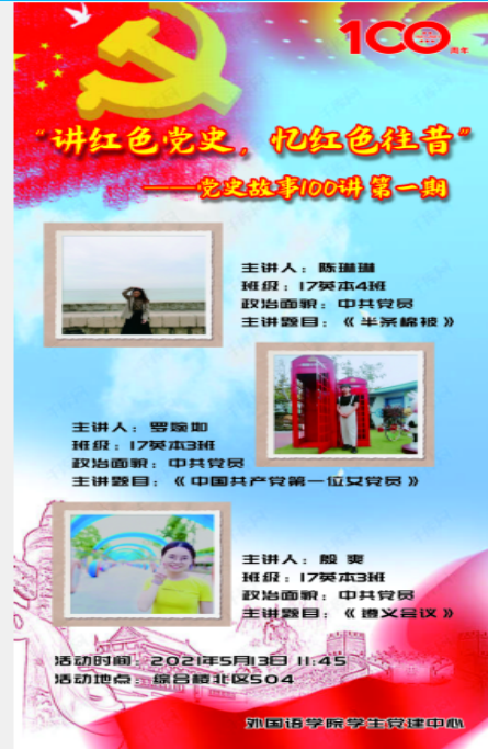 学生党建中心在综合楼北区504顺利开展“党史故事100讲”第一期活动。本期活动由三位2017级的学生党员主讲,全院各班学生代表积极到场观看。