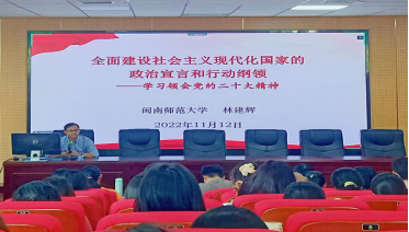 思想之旗领航向,人间正道开新篇。林建辉老师从党的二十大及其重要意义、二十大报告提出的新论断、新要求以及以中国式现代化全面推进中华民族伟大复兴三个部分全面系统的解读了二十大精神。他指出,中国共产党的百年奋斗历程,是一个不断谱写马克思主义中国化时代化的壮阔历程,是一个持续追求真理、揭示真理、笃行真理的奋进历程,是一个始终坚持用马克思主义科学理论指导实践、解决问题、谋求发展的复兴历程。