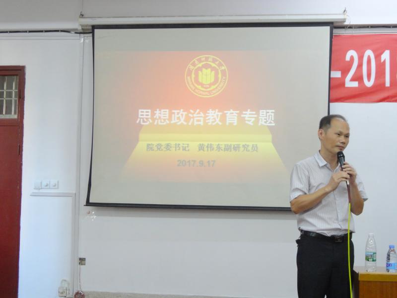 党委书记黄伟东副研究员主讲,题为《我的大学梦》思想政治教育讲座在逸夫楼梯教二以及东门阶梯教室二拉开帷幕。本次讲座中,黄书记引经据典的同时结合自己的人生经验,给17级新生们带来了开学的“第一课。本次讲座分为以下三个部分: