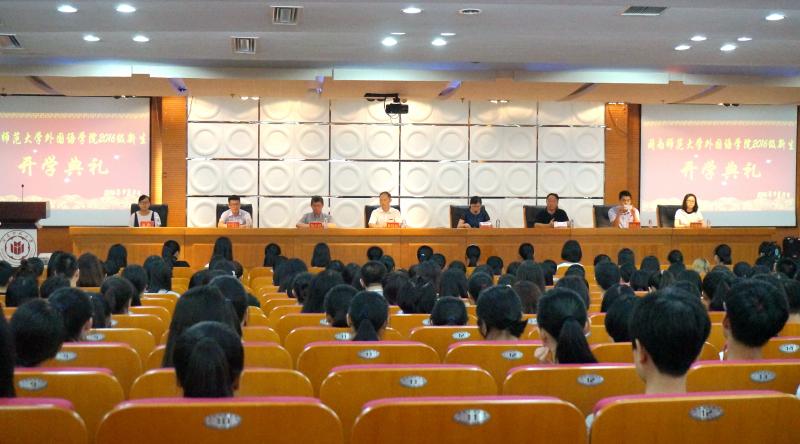2016级新生开学典礼在逸夫图书馆五楼报告厅隆重召开,典礼由学院团委副书记项梅老师主持,院党委书记黄伟东、院长吴玉玲教授、副院长苏建华副教授、教师代表郑声滔教授、新生辅导员及全体16级新生出席典礼。