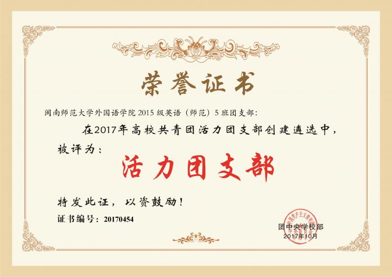 2015级英语(师范)5班团支部有成员32人,是一个朝气蓬勃,充满活力的团组织。在院领导、老师以及团委的领导下,团支部始终做到核心作用好、组织健全,并积极开展各项活动,曾获校十佳团支部立项、校“共青团示范岗”称号等荣誉。