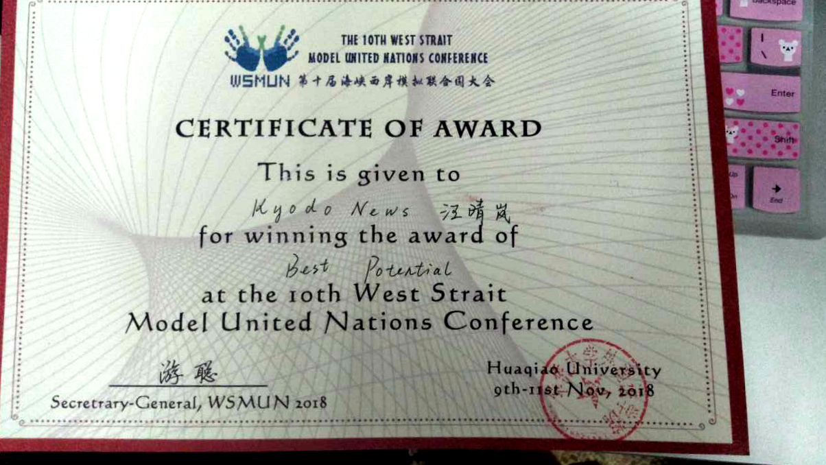 汪晴岚同学获得了MPC委员会Best Potential(最具潜力奖),作为共同社新闻记者,她用锋利的笔触、敏锐的思维写出了大量精彩的新闻简讯与社论,在新闻发布会上犀利独特的提问,体现了作为媒体新闻人的睿智与独到深刻的个人见解。