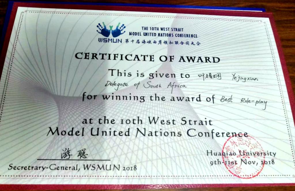 叶婧娴同学获得了WTO委员会Best Role-play(最佳角色扮演奖),作为南非国家代表,她在会议中积极发声与其他国家进行磋商,为本国争取利益,凭借丰富的模联参会经验与其他代表共同书写工作文件及决议草案。