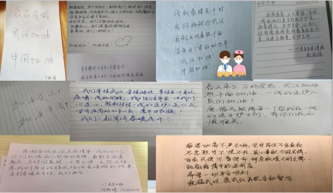 18英本5班团支部成员们自觉担起责任,率先垂范,主动为社区儿童提供志愿教学服务,积极传播正能量,展现了新时代青年大学生的精神面貌和使命担当。18英本2班的青年志愿者们从实际出发,凭借自己的爱心和知识,利用创新思维打破空间限制,通过在线手段,以灵活有效、丰富多彩的形式,积极开展线上英语学习志愿服务活动,积极帮助初一至高三英语备考生及四六级备考生。17英本4班、19英本3班以及19商英3班团支部通过组织团员们手写祝福的形式表达了对武汉、对祖国的深情祝福,表达了各自对抗击疫情人员的衷心敬佩,展现了当代青年大学生对疫情的关注与关怀。