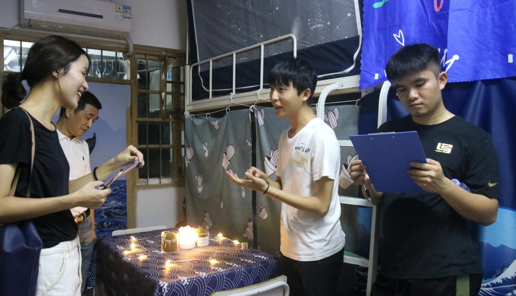 11月26日晚7时,学院党委副书记朱兆军老师,团委副书记张啸啸老师,辅导员蔡志桥、梁燕辉、陈安迪以及吴颖婕老师应邀走访宿舍,对入围决赛的宿舍进行评分。评委老师们逐一走进参赛宿舍,与同学们亲切交流,深入了解装扮理念并进行点评打分。老师们鼓励同学们要积极构建文明和谐的宿舍文化,营造“儒雅之风、优雅之气、文明之韵、温馨之味”的宿舍文化氛围。