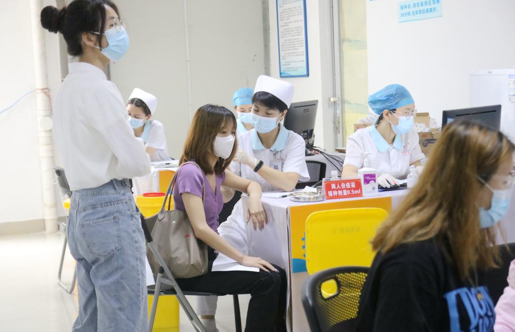 龙文馆场内新增的空调给忙碌工作的医生、志愿者和耐心排队的同学们带来丝丝凉风,让等待的过程变得不那么难耐;场馆被划分为登记台、预检区、接种区、留待观察区四个部分,分别有医生和志愿者认真坚守岗位。工作人员们一丝不苟,同学们有序排队,龙文馆疫苗接种工作顺利进行着!