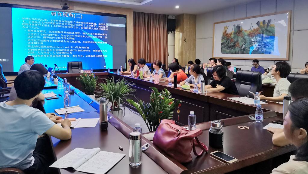 杨金才教授从学术研究的属性和总体要求出发,讲解了以文献检索、恰当选题、文献再综述、分析论述、修改为主的文学研究路径,结合当前文学研究现状,给外语师生们提出诸如“在跨文化背景下,讲中国故事不应只局限于中国二字,还应该以中国立场讲世界故事”的要求。之后,他以部分论题和时事为例,给大家提供并解释了文化研究、文本和理论研究、跨国界和跨文化研究这三个研究视角。他总结道“学术论文的重点是提出问题并解决问题。做学术论文一定要关注读者,关注论证过程,关注前人的解释和论据的新颖程度”。