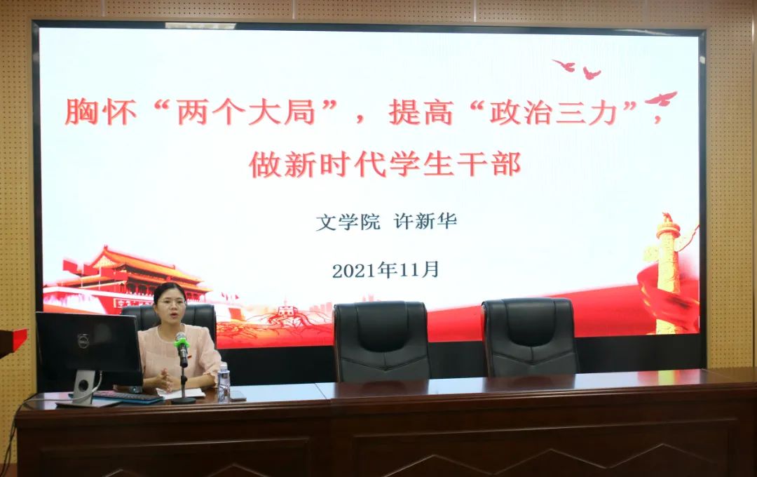 分团校学生骨干培训班第四讲“胸怀‘两个大局’,提高‘政治三力’,做新时代学生干部”在逸夫楼梯教二举行。文学院辅导员、福建师范大学思想政治教育专业在读博士许新华老师受邀担任讲师。本次培训由院团委副书记张啸啸老师担任主持。