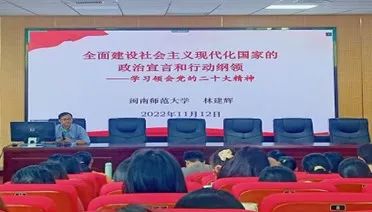 思想之旗领航向,人间正道开新篇。林建辉老师从党的二十大及其重要意义、二十大报告提出的新论断、新要求以及以中国式现代化全面推进中华民族伟大复兴三个部分全面系统地解读了二十大精神。他指出,中国共产党的百年奋斗历程,是一个不断谱写马克思主义中国化时代化的壮阔历程,是一个持续追求真理、揭示真理、笃行真理的奋进历程,是一个始终坚持用马克思主义科学理论指导实践、解决问题、谋求发展的复兴历程。