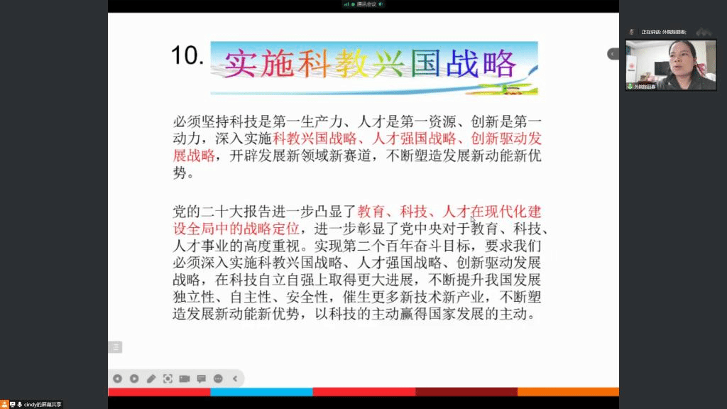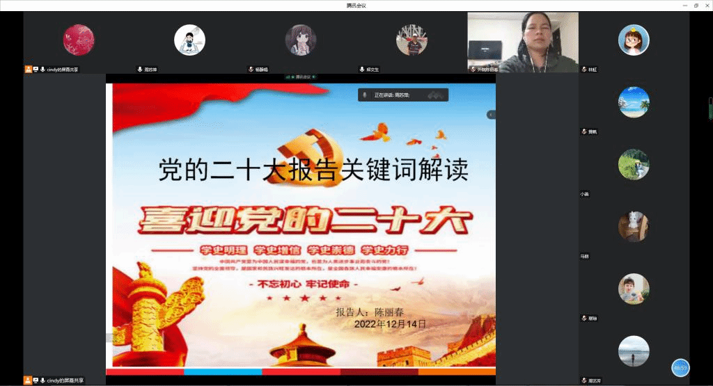 大英部第一党支部全体党员通过腾讯会议的方式,在线开展党的二十大报告学习活动。会议由支部副书记周苏萍同志主持,教师党员陈丽春同志主讲,学院党委委员邱文生同志应邀出席本次活动,并作点评指导。