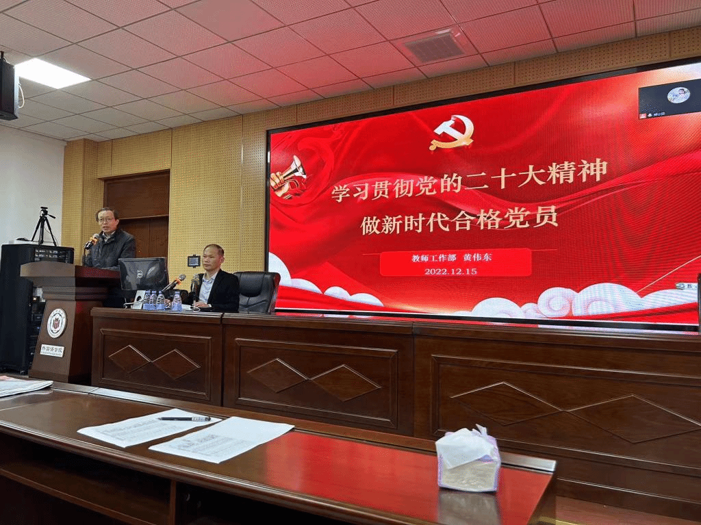 教师工作处处长黄伟东同志做《学习贯彻党的二十大精神 做新时代合格党员》主题党课。黄处长以新时代新征程中国共产党的使命任务、对文化建设、教育科技人才的需求以及习总书记在党的二十大报告中对青年的期望为切入点,从疫情下的中国共产党、新时代中的共产党员、做新时代合格党员三个部分进行阐述。他详细阐述了疫情下党的领导智慧和历史担当以及新时代共产党员在接过历史的接力棒要必须呈现出的责任与担当。最后他对新时代合格党员提出了必须保持党员的自觉自律、必须牢记党的历史、必须坚定政治信念、必须具备敬畏心理、必须勇于担当负责、必须进取奉献作为的六点要求。