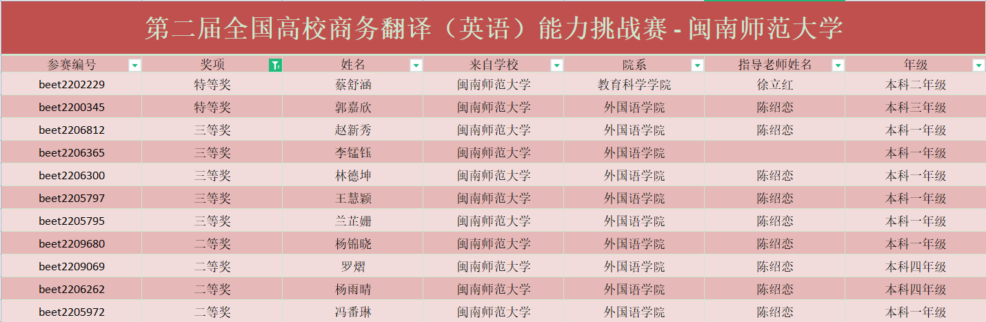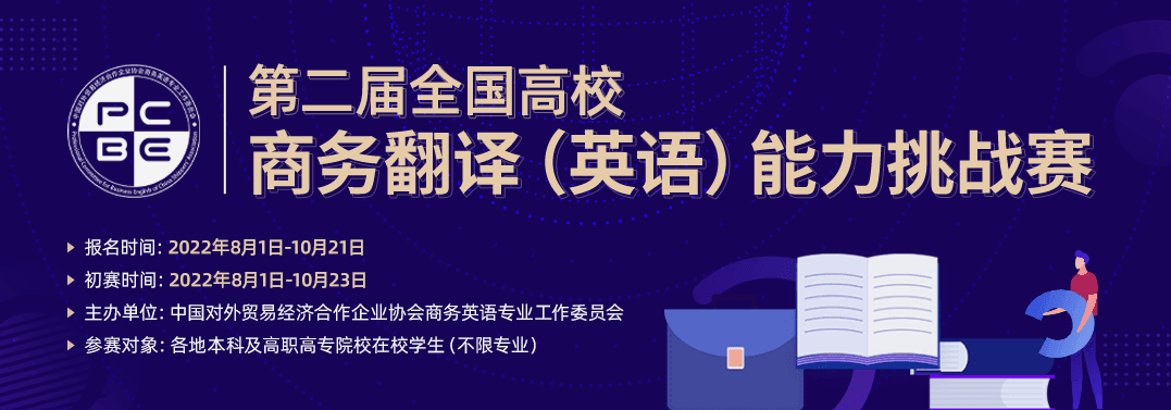 为贯彻落实《普通高等学校本科外国语言文学类教学质量国家标准》、《普通高等学校本科商务英语专业教学指南》,执行国家标准GB/T 30539-2014 国际贸易业务人员商务外语能力标识规范、GB/T 28158-2011国际贸易业务的职业分类与资质管理,探索商务英语专业以赛促教、以赛促学的途径与方法,培养院校学生商务翻译能力和相关职业素养,搭建专业建设交流和学生风采展示平台,“全国高校商务翻译(英语)能力挑战赛”于2022年8月-11月举办。