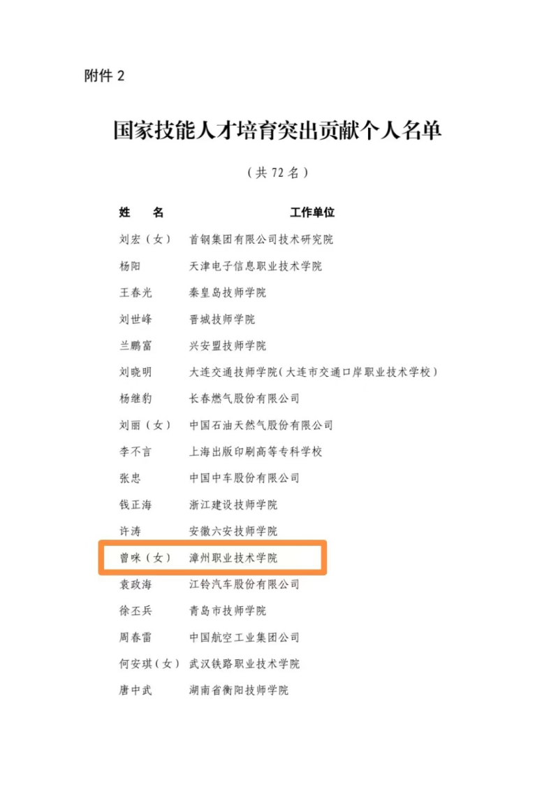 其中漳州师范学院英语系90级英本校友,漳州职业技术学院文化旅游学院党总支书记-曾咪。作为福建省高校唯一“国家技能人才培育突出贡献个人”入选。