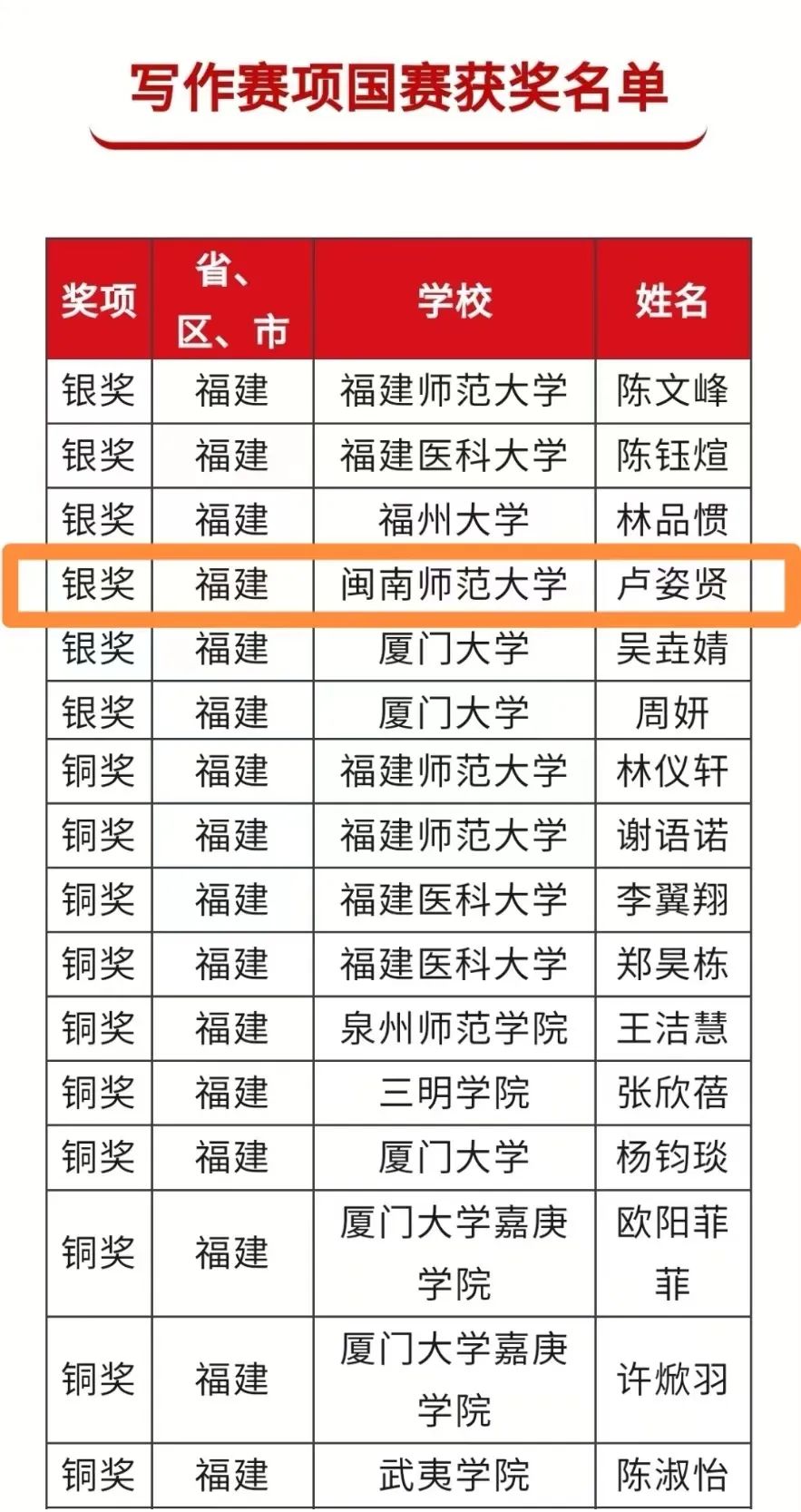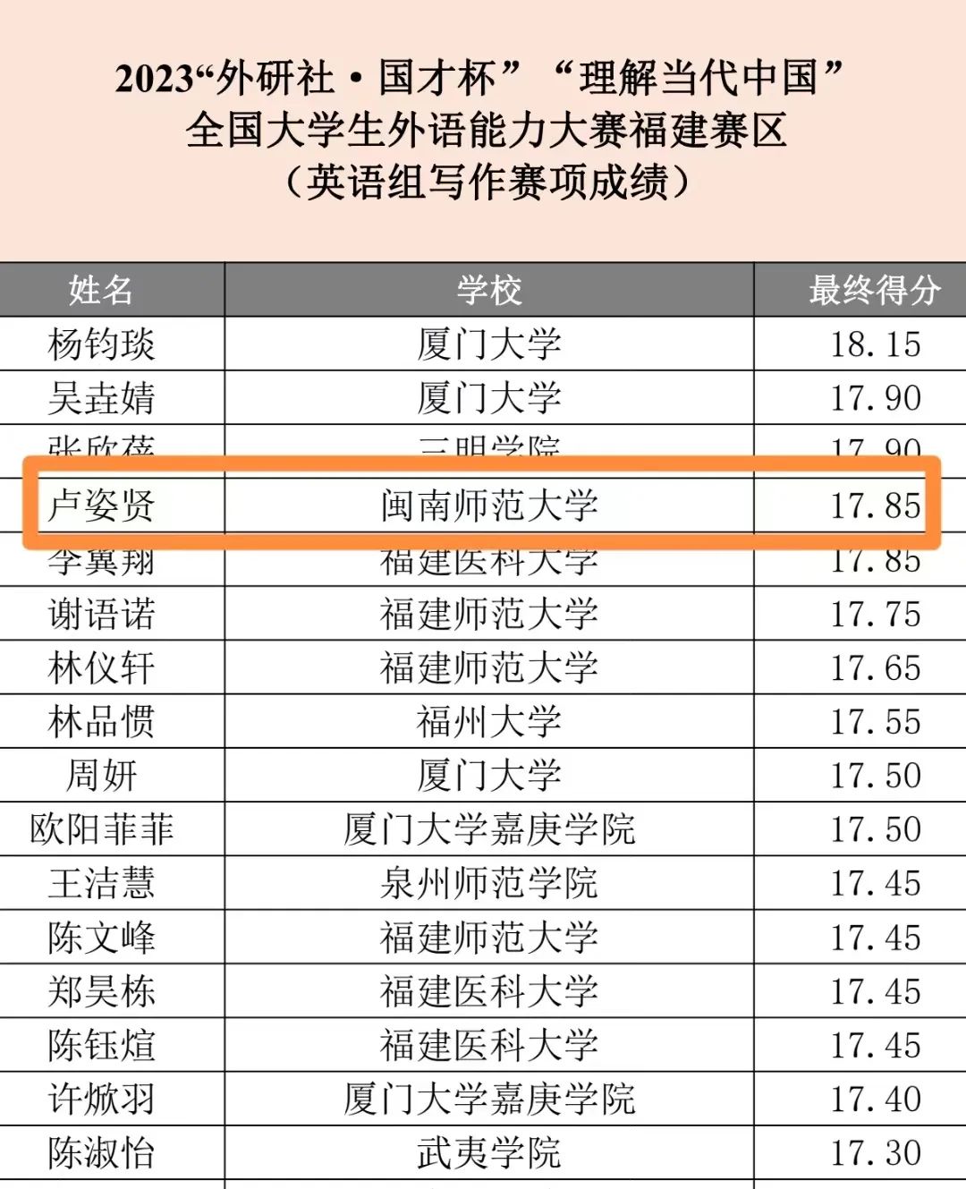 一共派出8名同学参赛(专业和大外各4名)。在省赛中,卢姿贤同学(下方集体照右二)便以17.85分的高分脱颖而出,并以并列第四的好成绩获得福建省一等奖,成功晋级全国决赛。11月25日,英语组写作赛项全国决赛在线上拉开帷幕。今年的写作赛项国赛题目要求选手撰写记叙文和议论文各1篇。记叙文要求选手以“友谊的种子”为题,撰写一个真实或想象的故事,议论文要求选手辩证探讨“科学的颠覆性减弱”对我们的影响,引导选手关注时代热点、勇担家国之责。卢姿贤同学以清晰的思维逻辑和扎实的语言功底书写深刻观点、讲述中国故事,最终荣获全国决赛银奖。