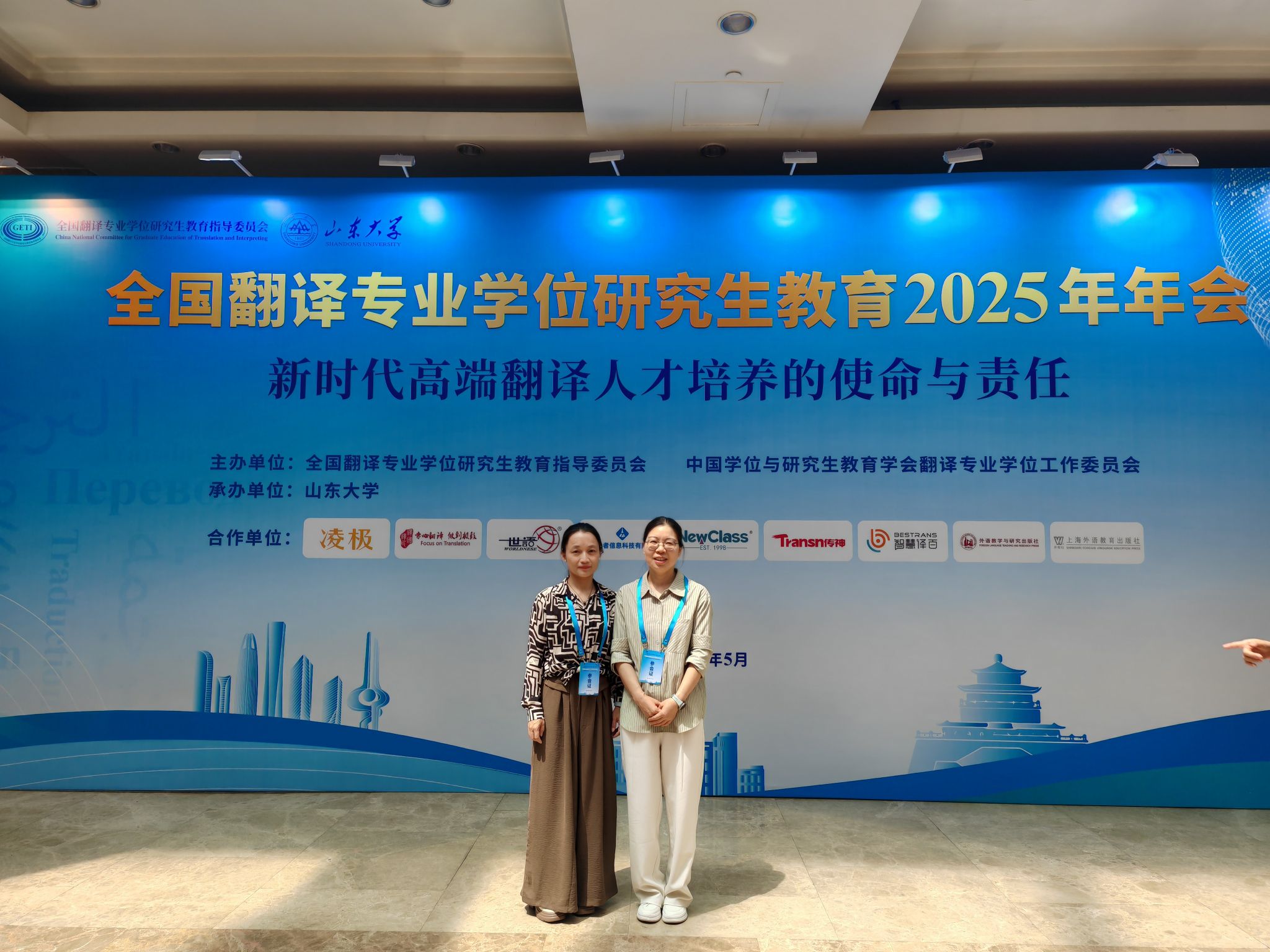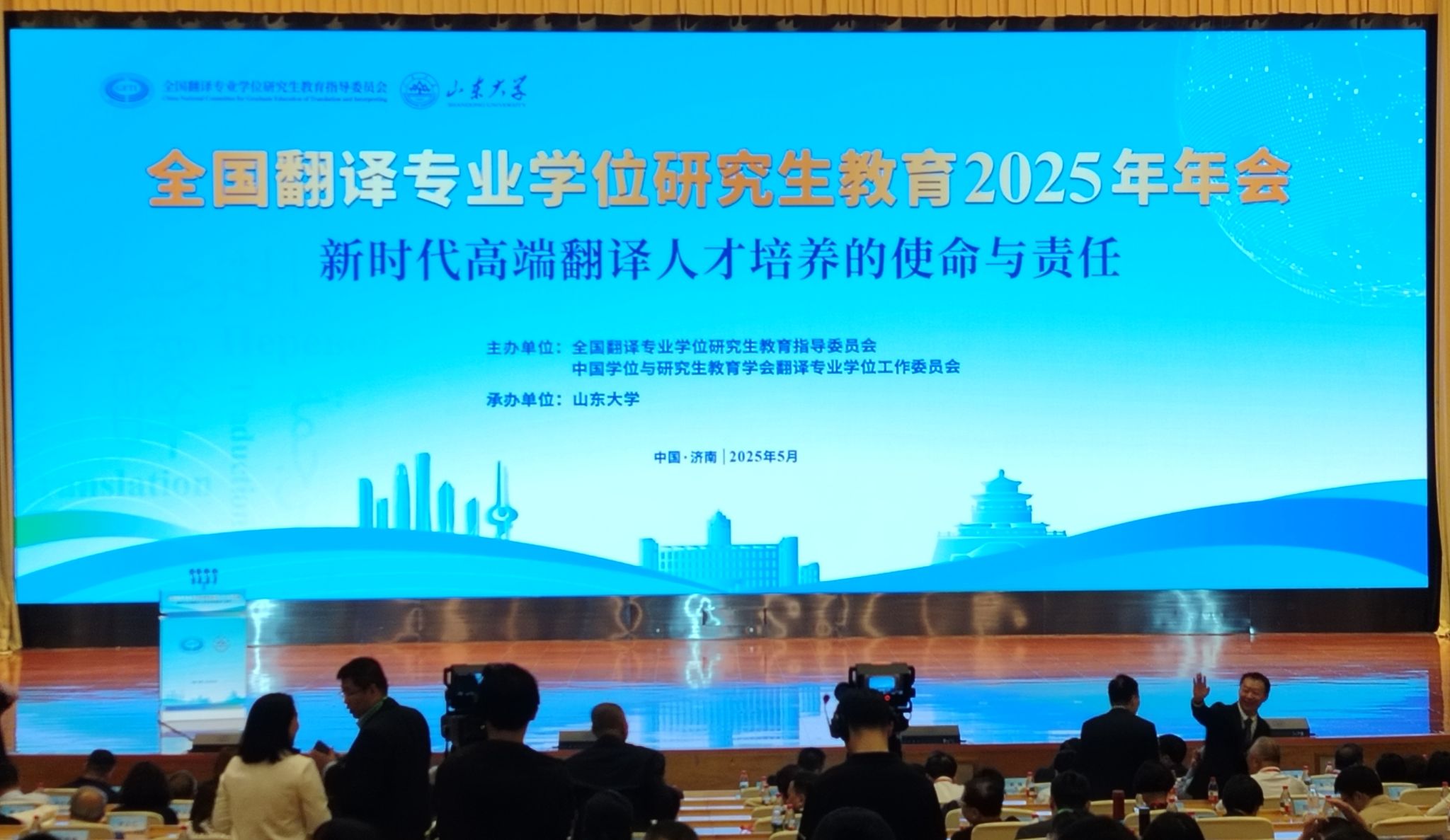 院长钟惠芸、翻译系副主任邱绪萍参加了在山东济南举行的全国翻译专业学位研究生教育2025年年会。会议以新时代高端翻译人才培养的使命与责任为主题,聚焦“使命、机遇、实干”三大关键词。专家学者就“智能语言风起云涌,翻译驶入高端发展新赛道”、“重塑翻译认知,回应时代挑战”、“质量为上,行稳致远”、“AI驱动的翻译与翻译教育模式创新”、“探索项目制培养路径,提升翻译专业师资水平”等做了主旨报告,同时就高端翻译职业胜任力培养路径、技术赋能翻译实践成果创新、案例库建设与专业学位教育、双师型师资队伍培养机制和多模态翻译教材的设计等议题展开了深入讨论。