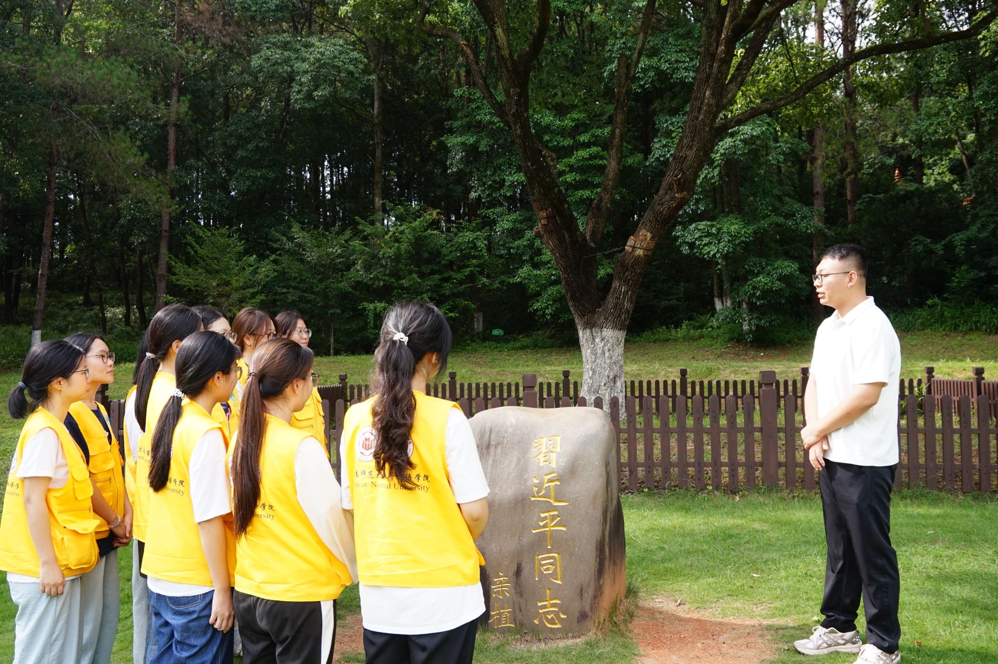 8月1日,实践队循着习近平总书记的足迹,追溯生态治理“长汀经验”的实践脉络,走进长汀县河田镇,近距离探寻以水土流失治理为核心,通过生态修复、生物多样性保护及乡村协同治理形成的“长汀经验”。在汀江源国家级自然教育馆和长汀水土保持科教园,队员们借地貌对比图文和多样动植物标本,了解生态蜕变的历程和汀江流域生物多样性。在河田镇世纪生态园,队员们瞻仰习近平总书记亲手种植的香樟树,体悟“功成不必在我,功成必定有我”的担当与情怀。随后,实践队深入水土治理模范村露湖村,开展一场水土保持访谈会,与村干部聊现状、探方法、话未来,为生态守护凝聚青春思考。