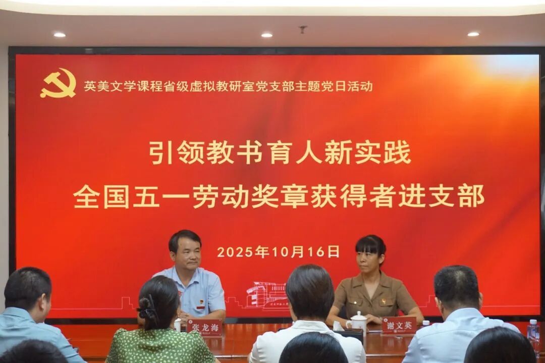 英美文学课程省级虚拟教研室党支部在科技楼北1507举办“引领教书育人新实践——全国五一劳动奖章获得者进支部”主题党日活动。