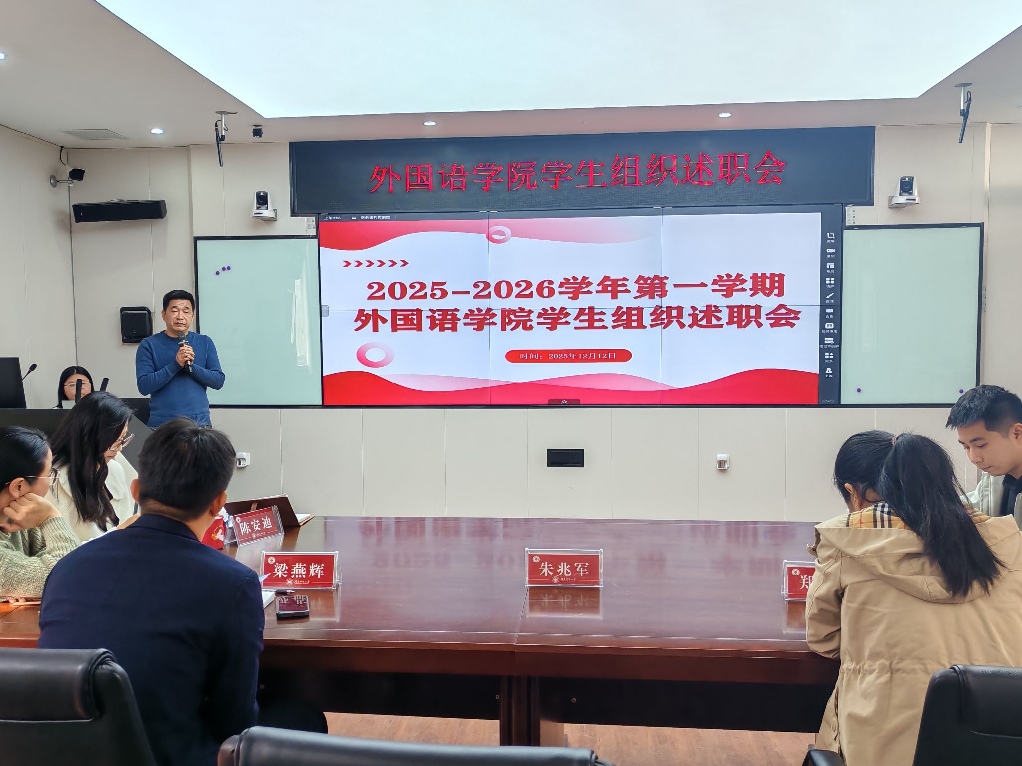 于12月12日在综西502举行了2025-2026学年学生组织述职大会。学院党委副书记朱兆军、各学生组织指导老师、A类干部参加本次活动。