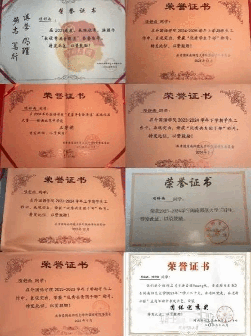 青年志愿者中心主任、班级班长。思想上,她政治立场坚定,主动通过实践深化理论认知,曾于寒假期间赴中共泉州市鲤城区委组织部机关党建股开展专项实习。学生工作方面,她在担任外院青志中心主任与班长期间,统筹协调能力强,高效完成工作,获评校级“优秀共青团员”1次、院级“优秀共青团干部”2次及院级“优秀学生干部”1次。专业学习上勤奋刻苦,曾获校二等奖学金、校“三好学生”等荣誉;竞赛实践成果突出,曾获2025年全国大学生英语竞赛校三等奖、2024年韩素音国际翻译大赛优秀奖等多项奖项。此外,她多次参与寒暑期社会实践,获评校级“社会实践先进个人”称号,展现出全面的综合素质。