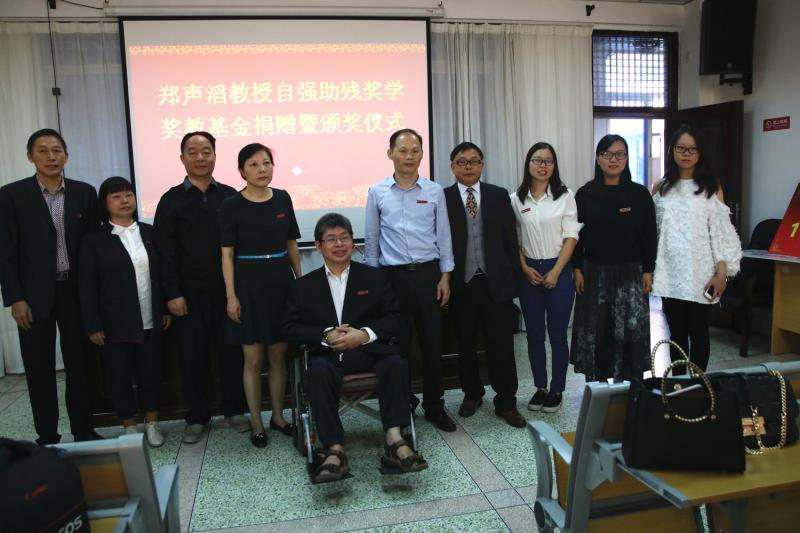 郑声滔教授向学院捐赠100万元设立“自强助残奖学奖教基金”捐赠暨颁奖仪式在综合楼中区504会议室举行。捐赠人郑声滔教授,院长吴玉玲,党委书记黄伟东,副院长苏建华,自强大学筹备处主任储永平先生出席仪式。郑教授团队工作人员,学院辅导员、教师和学生代表等参加活动。仪式由院团委副书记项梅主持。