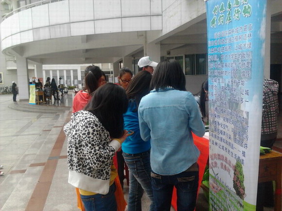 2013年4月13号下午3时,外语系青年志愿者中心在瑞京宿舍区和达理宿舍区开展以“创建国家森林城市”为主题的微博推广宣传活动。
