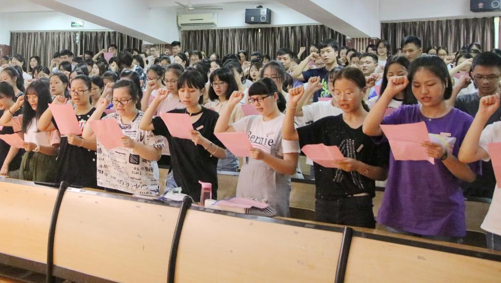 在博文西区楼梯二教室举行2018级新生开学典礼。学院党委书记黄伟东、院长吴玉玲、副院长苏建华,党委副书记陈慧燕、91级优秀校友吴云开,教师代表李金梅及新生辅导员老师出席典礼。典礼由学院团委书记项梅老师主持。