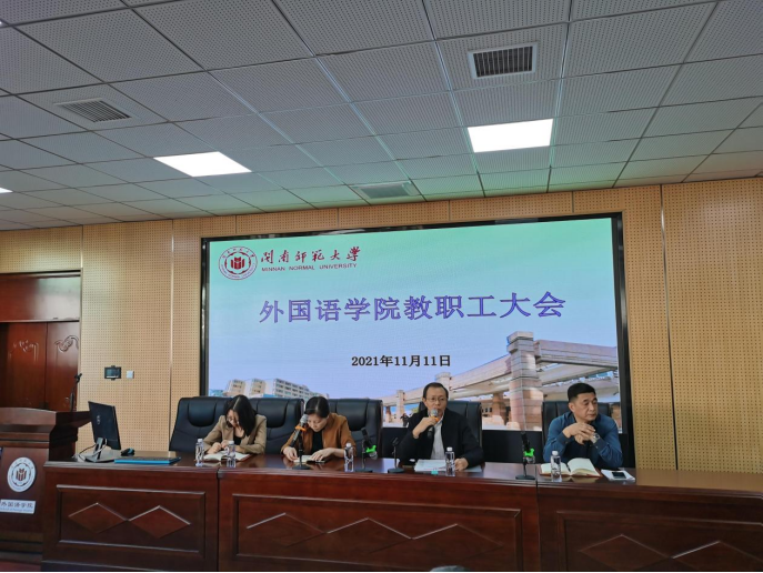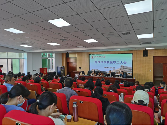 随后,吴玉玲院长回顾了一年来学院的学科和专业建设各项工作以及目前已经取得的成就,充分肯定了相关老师在申请“国家一流专业”“英语师范专业二级认证”“国家一流课程”以及“翻译专业硕士”的努力参与和付出,并指出应整合全院的力量为2023年即将到来一级学科硕士点申报工作继续努力。同时,吴院长也通报了本学期期中教学检查学生座谈会学生所提出的意见,指出教学工作是根本,要求广大教师应不断地进行教学反思,并根据学生反映的意见改进教学方法,提高自身的教育教学水平。同时吴院长也就即将开展的非师范专业实习指导和2021年年度考核等事宜进行工作布置,动员广大教师为学院建立新的非师实习点添砖加瓦。