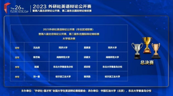 8月26日至27日,“外研社·国才杯”全国大学生英语辩论赛组委会联合中国石油大学(北京)、东北大学秦皇岛分校举办2023外研社英语辩论公开赛(华北区域联赛)暨第八届北京辩论公开赛、第二届东北国际辩论锦标赛。