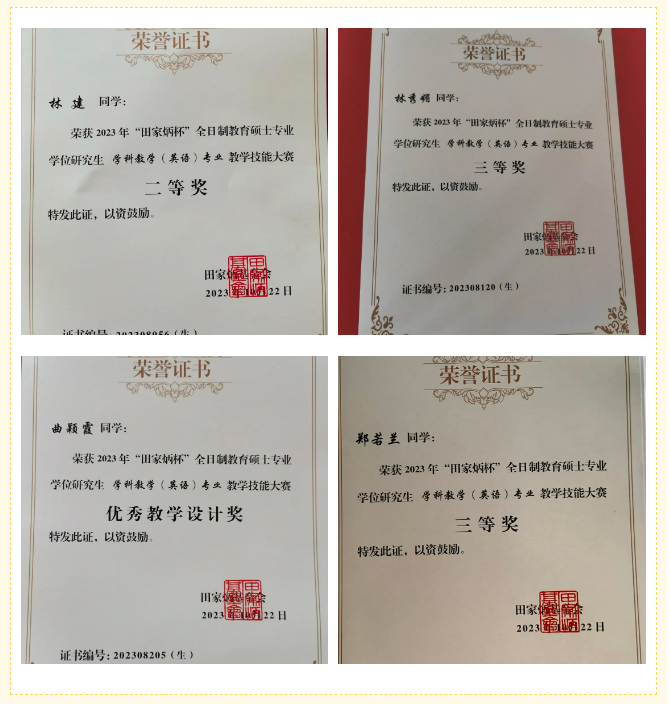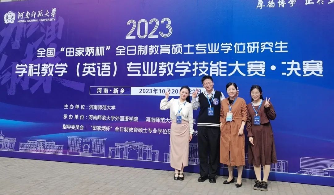10月20—22日,2023年全国“田家炳杯”全日制教育硕士专业学位研究生学科教学(英语)专业教学技能大赛决赛在河南师范大学顺利举行。2022级学科教学(英语)研究生林建、郑若兰、林秀媚和曲颖霞同学在吴玉玲老师和陈彩虹老师的带领和指导下参加本次大赛并获得佳绩。