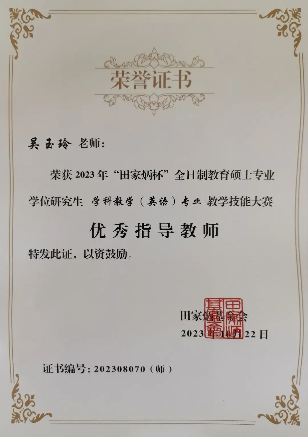 选手以端庄大方的教姿教态、富有感染力的语言和扎实的语言技能向大家展示了自己的教学风采,在比赛中脱颖而出。吴玉玲老师指导的研究生林建、郑若兰分别荣获全国二等奖和全国三等奖;陈彩虹老师指导的研究生林秀媚荣获全国三等奖,王羽青老师指导的研究生曲颖霞荣获优秀教学设计奖。吴玉玲老师荣获2023年全国“田家炳杯”全日制教育硕士专业学位研究生学科教学(英语)教学技能大赛优秀指导教师。