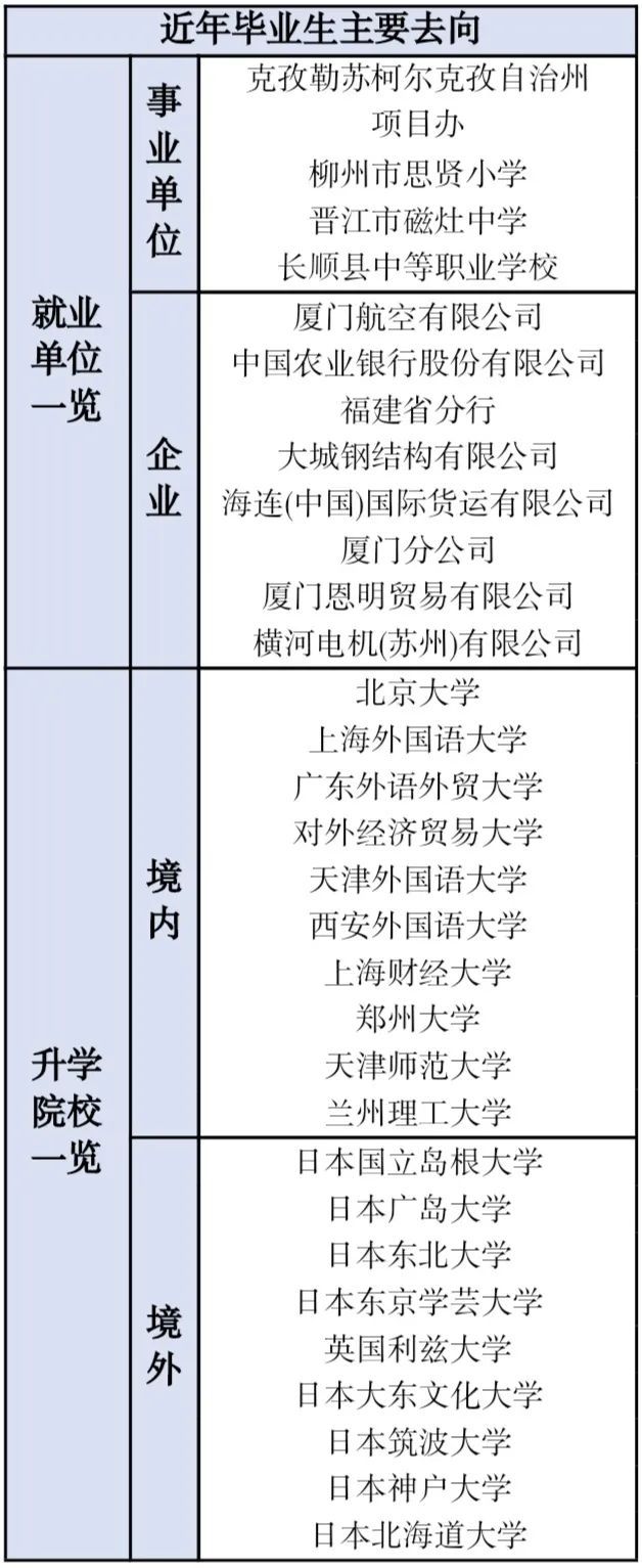 本专业毕业生可在涉外企事业单位、中日合资企业、各类学校及语言培训机构等部门从事对日贸易、跨境电商运营、日语教学等工作,或直接赴日就业。亦可国内读研或出国留学,继续深造。